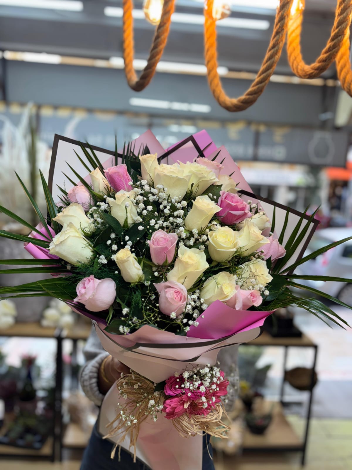 25 adet pembe ve beyaz gül ile hazırlanan bu özel buket, masumiyetin zarafetle buluştuğu romantik bir tasarımdır. Beyaz güllerin saf duyguları, pembe güllerin sıcak sevgiyi temsil ettiği bu buket, sevdiklerinize duygularınızı en zarif haliyle ifade eder.