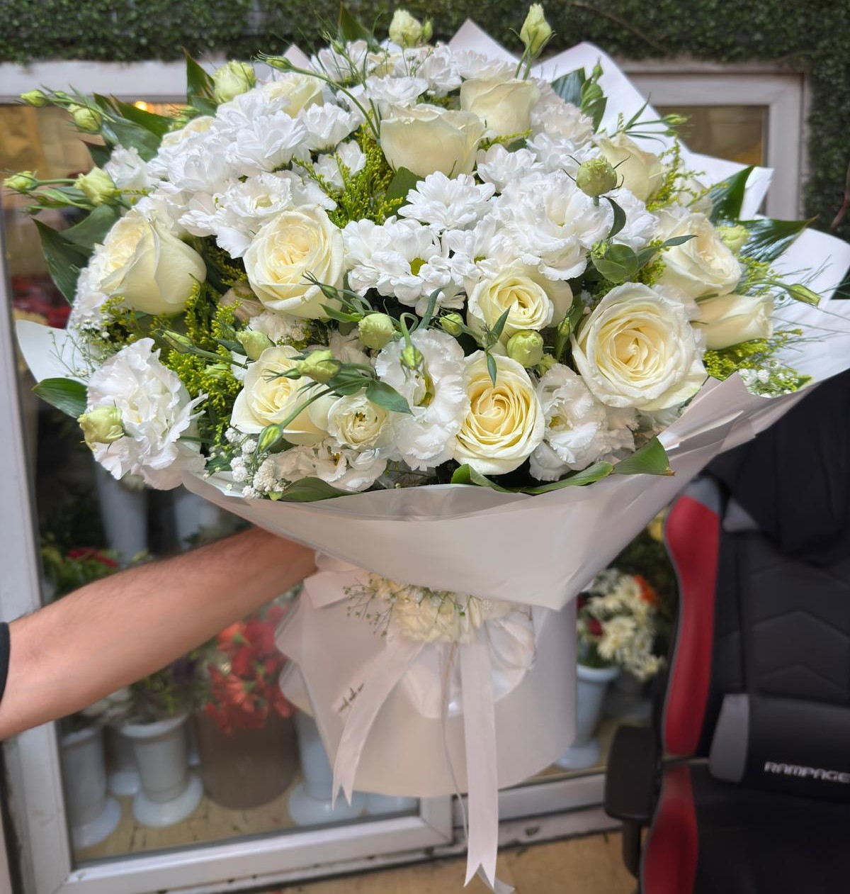 Beyaz Gül ve Karışık Beyaz Çiçek Buketi – Saflığın ve Zarafetin Simgesi ????✨