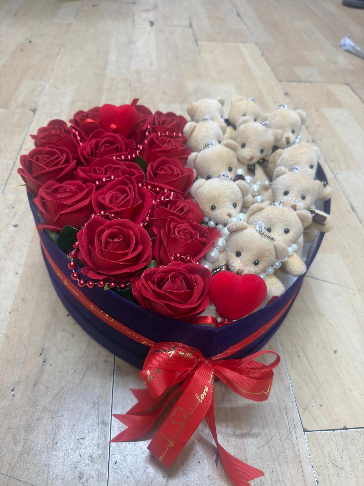 Kalpli Kutunun İçinde Yapay Kırmızı Gül Peluş Ayı Arajmanı