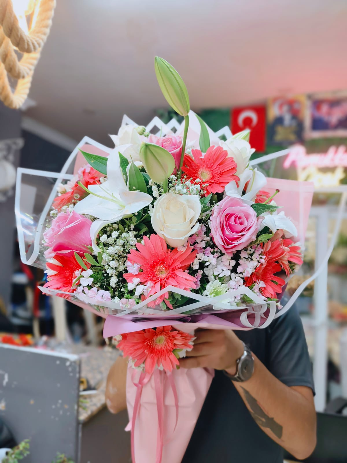 pembe ve beyaz gül ve Kır Çiçeklerinden ile hazırlanan bu özel buket, masumiyetin zarafetle buluştuğu romantik bir tasarımdır. Beyaz güllerin saf duyguları, pembe güllerin sıcak sevgiyi temsil ettiği bu buket, sevdiklerinize duygularınızı en zarif haliyle ifade eder.